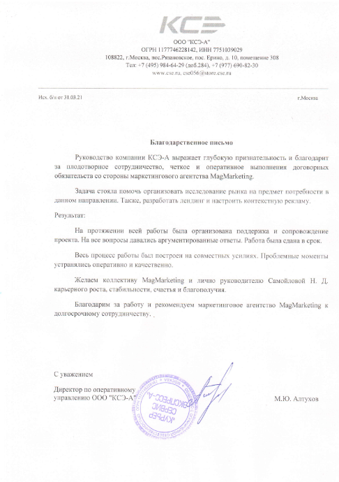 "Компания КСЭ-А под руководством Алтухова М.Ю., выражает глубокую признательность и благодарит за плодотворное сотрудничество, четкое и оперативное выполнения договорных обязательств со стороны маркетингового агентства MagMarketing.