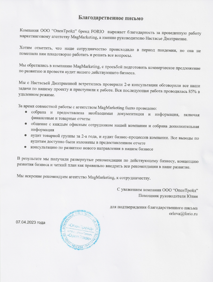 "Компания Опентрейд бренд “Forio” выражает благодарность за проведенную работу маркетинговому агентству MagMarketing, а именно руководителю Самойловой Настасье Дмитриевне.